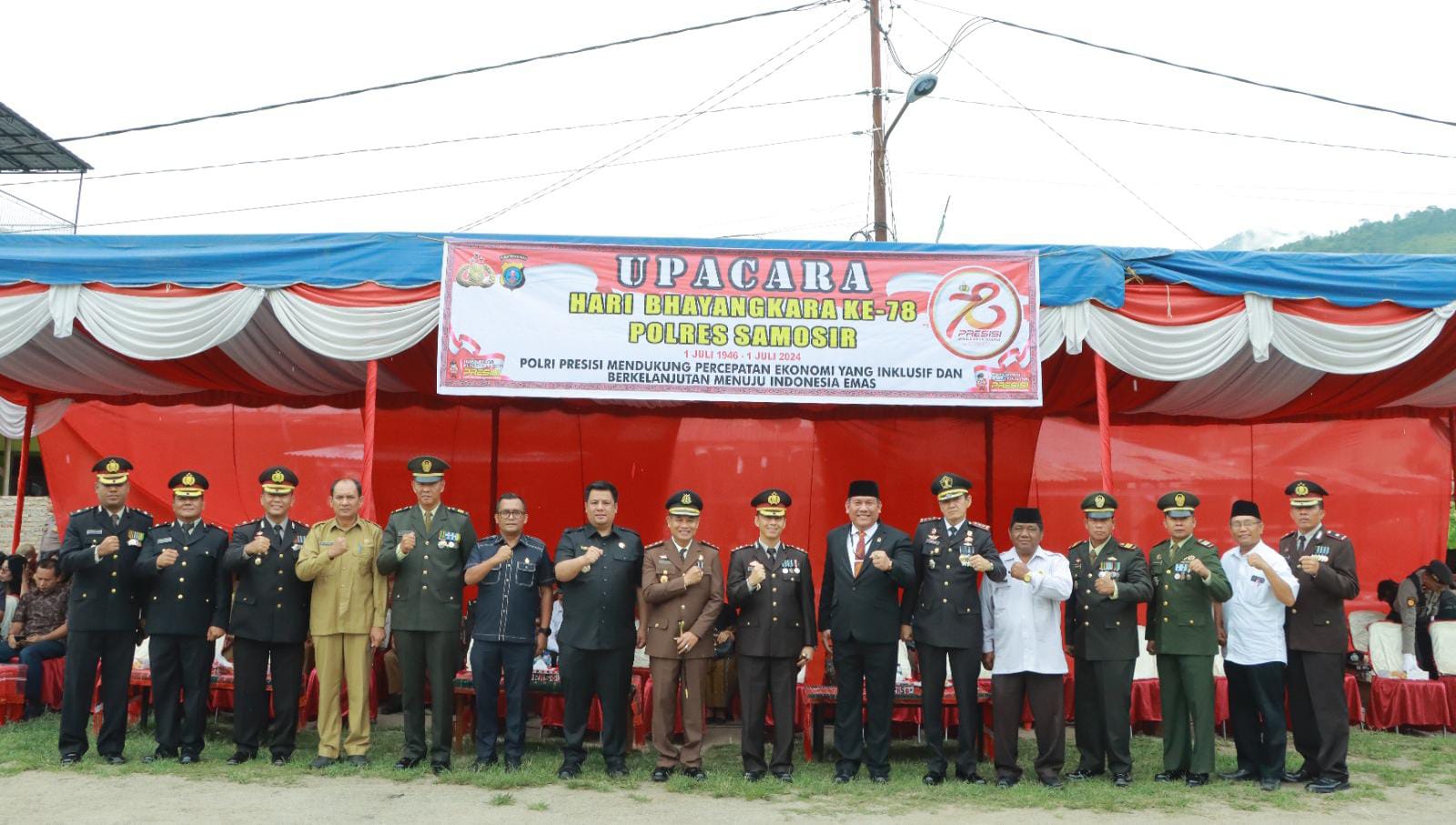 Syukuran Hari Bhayangkara ke 78 Polres Samosir dihadiri oleh Forkopimda Kabupaten Samosir Kapolres Samosir AKBP Yogie Hardiman, S.H.,S.I.K.,M.H, Bupati Samosir Vandiko Timotius Gultom S.T, Wakil Bupati Samosir Drs. Martua Sitanggang, M.M, Pabung 0210/TU Kapten G. Sebayang, Kajari Kab. Samosir Karya Graham Huta Gaol, S.H., S.Hum, Anggota DPRD Kab. Samosir Marko Kristian Simbolon, S.T, Kalapas Kelas III Pangururan Jeremia Leonta, Ketua PN balige Makmur Pakpahan,S.H., M. H, Ketua KPU Kab. Samosir Vincentius Sitinjak, Ketua Bawaslu Kab. Samosir Robinson Simarmata, ketua FKTM Kab. Samosir Obin Naibaho, Para Camat, Kapolsek, Danramil, Purnawirawan Polri dan Tamu Undangan sera