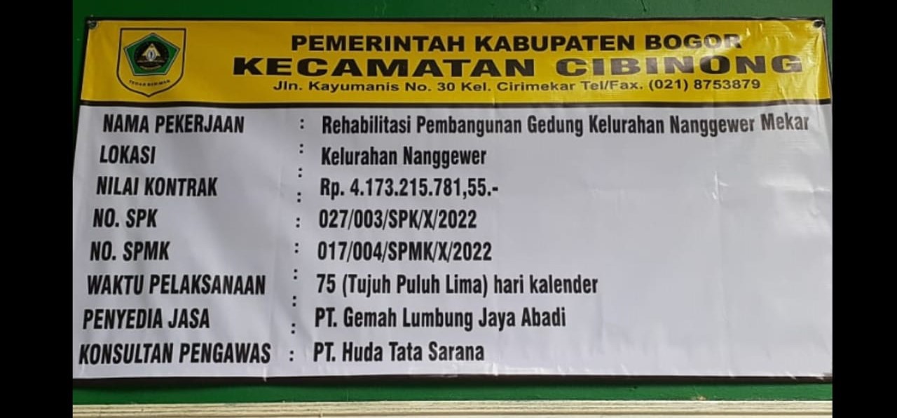 Cibinong | mediasinarpagigroup.com – Gedung Kantor Kelurahan Nanggewer Mekar pada tahun 2022 di bongkar total dan dibangun kembali menelan anggaran sebesar Rp, 4.171.215.781.55,- di kerjakan oleh PT ,Gemah Lumbung Jaya Abadi dan konsultan pengawas ,PT..Huda Tata Sarana dana berasal dari APBD, Kab. Bogor.