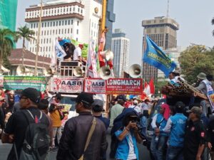 Jakarta I mediasinarpagigroup.com – Kamis (10/8/2023) Aksi unjuk rasa dari berbagai daerah titik kumpul patung kuda Monas Gambir Jakarta Pusat. Ribuan Buruh berkumpul dari berbagai daerah seperti daerah Tangerang, Bandung, Bekasi, Jakarta. Para buruh berkumpul sambil berorasi empat runtutan kepada pemerintah yang dilakukan oleh buruh seluruh Indonesia bertempat di jalan Patung Kuda Monas, DKI Jakarta, Kamis (10/8/2023).