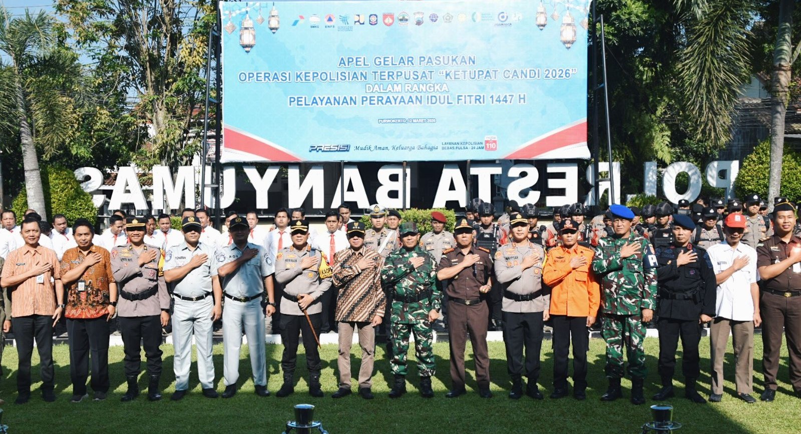 Banyumas | mediasinarpagigroup.com – Pemkab Banyumas bersama jajaran TNI, Polri, serta berbagai pemangku kepentingan menghadiri Apel Gelar Pasukan Operasi Kepolisian Terpusat Ketupat Candi 2026 dalam rangka pengamanan perayaan Idul Fitri 1447 Hijriah. Kegiatan tersebut dilaksanakan di halaman Polres Banyumas pada Kamis (12/03/2026). Apel tersebut dihadiri oleh Bupati Banyumas Sadewo Tri Lastiono, Kapolresta Banyumas Kombes Pol. Petrus Silalahi, unsur Forkopimda, jajaran TNI-Polri, serta tamu undangan dari berbagai organisasi dan instansi terkait.