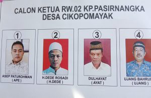 Demikian juga calon Ketua RW persyaratan pencalonan yaitu warga yang berdomisili Kampung Pasirnangka yang tinggal di lingkungan RW 02 dan sudah mempunyai bukti surat vaksin, Poto copy KTP dan Poto copy KK , adapun nama – nama calon ketua RW 02 tersebut adalah 1 Asep Pathurohman ( Ape) 2 H.Dede Rosadi (H.Dede) 3 Dulhayat (Ayat) 4 Ujang Bahrudin (Ujang)