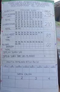 Adapun jumlah surat hak pilih warga lingkungan RW 02 sebanyak 772 orang yang hadir 581 orang terdiri dari 5 RT pemilihan ketua RW dilaksanakan jam 08.00 wib s/d selesai, adapun yang terpilih dalam pemilihan Ketua RW.02 yaitu calon No 1 yaitu Asep Pathurohman memperoleh suara sebanayak 232 sementara H.Rosadi 210 Suara, Dulhayat 89 Suara, Ujang bahrudin 60 Suara lalu jumlah suara tidak sah serta balnko yaitu 11 surat suara.