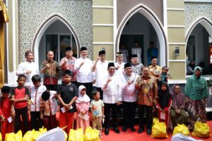 Usai peresmian dan penyerahan wakaf masjid, dilakukan penyerahan paket sembako dan santunan anak yatim dan dhuafa bagi masyarakat setempat.(Humas/H.Maswi)