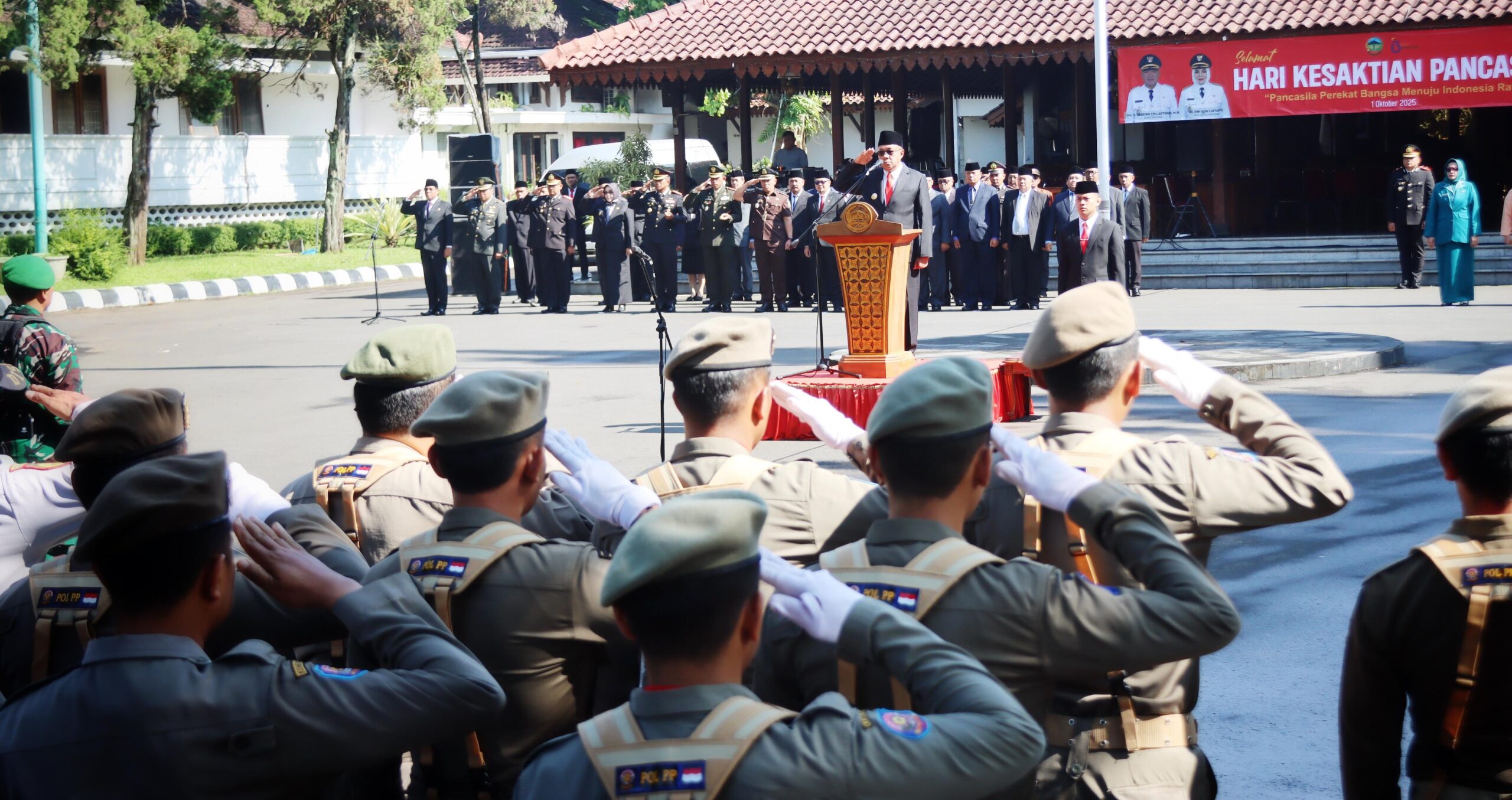 Banyumas  | mediasinarpagigroup.com – Pemerintah Kabupaten Banyumas menggelar Upacara Peringatan Hari Kesaktian Pancasila pada Rabu (01/10/2025) pagi di Halaman Pendopo Si Panji. Upacara dipimpin oleh Bupati Banyumas Sadewo Tri Lastiono dengan Perwira Upacara Kapolsek Purwokerto Timur Kompol Wiwid Hartono dan sebagai Komandan Upacara Danramil Kalibagor Kapten Kavaleri Khaerudin.