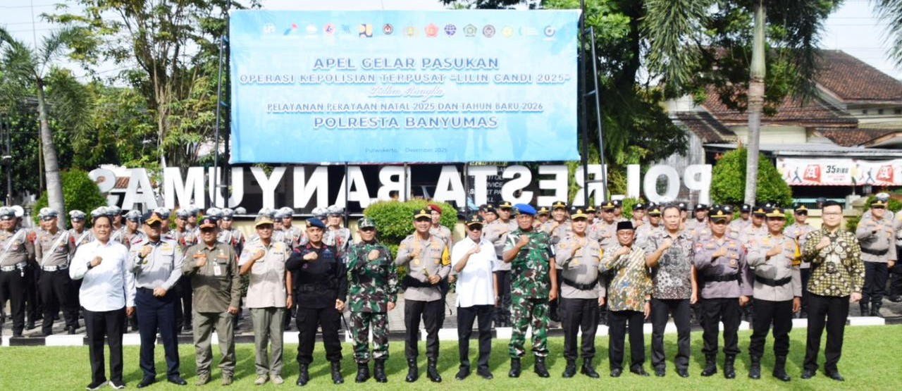 Banyumas | mediasinarpagigroup.com – Kepolisian Resort Kota (Polresta) Banyumas bersama Pemkab Banyumas menggelar Apel Gelar Pasukan Operasi Kepolisian Terpusat “Lilin Candi 2025” pada Jum’at (19/12/2025) di Halaman Markas Polresta Banyumas. Apel dipimpin oleh Bupati Banyumas Sadewo Tri Lastiono dengan didampingi Kapolresta Banyumas Kombespol Ari Wibowo dan Komandan Kasdim 0701 Banyumas Mayor Inf Asiz Lalo, dilakukan sebagai langkah final pengecekan kesiapan personel dan sarana prasarana dalam mengamankan perayaan Natal 2025 dan Tahun Baru 2026 (Nataru), yang akan digelar selama 14 hari kedepan, mulai 20 Desember 2025 – 2 Januari 2026