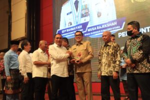 Samosir | mediasinarpagigroup.com – Bupati Samosir Vandiko T Gultom didampingi Pj. Sekda Naslindo Sirait, Kaban BPKPD Melva Siboro, Kadis Kominfo Immanuel Sitanggang menerima penghargaan atas Opini WTP Laporan Keuangan berturut-turut. Penghargaan tersebut, diberikan langsung oleh Gubernur Sumut Edy Rahmayadi pada acara Kick Off Meeting Opini WTP Laporan Keuangan Pemprovsu dan Kabupaten/Kota se-Sumut Tahun 2023, yang dilaksanakan di Grand Ballroom Hotel Adimulia Medan, Senin (14/8/2023). Turut hadir sekaligus Narasumber Inspektur Jenderal Kemendagri Tomsi Tohir, Kepala Perwakilan BPK Provsu Eydu Panjaitan, Kepala Perwakilan BPKP Provsu Kwinhatmake, perwakilan Kejatisu, mewakili Kapolda dan mewakili Pangdam I/BB.