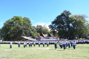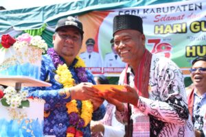 Samosir | mediasinarpagigroup.com – Bupati Samosir Vandiko T Gultom Pimpin upacara Peringatan Hari Guru Nasional yang dirangkai dengan perayaan HUT PGRI ke 78 tingkat Kabupaten Samosir dengan mengusung tema “Transformasi Guru Wujudkan Indonesia Maju” dan “Bergerak Bersama Rayakan Merdeka Belajar” bertempat di tanah lapang Kec. Pangururan, Senin (27/11). Turut hadir Wakapolres Samosir, Danramil 03/Pangururan, para Asisten, para Pimpinan SKPD, Camat dan Ketua PGRI Kab. Samosir
