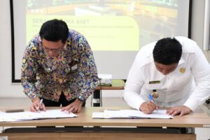 Samosir | mediasinarpagigroup.com – Bupati Samosir Vandiko Timotius Gultom,ST lakukan penandatangan serah terima pengelolaan Aset Barang Milik Negara (BMN) antara Direktorat Jenderal Cipta Karya Kementerian PUPR dengan Pemerintah Kabupaten Samosir di Kantor Balai Pengembangan Kompetensi PUPR Wilayah I Medan yang berlokasi di Jl. Busi No. 2 Medan, (06/03)