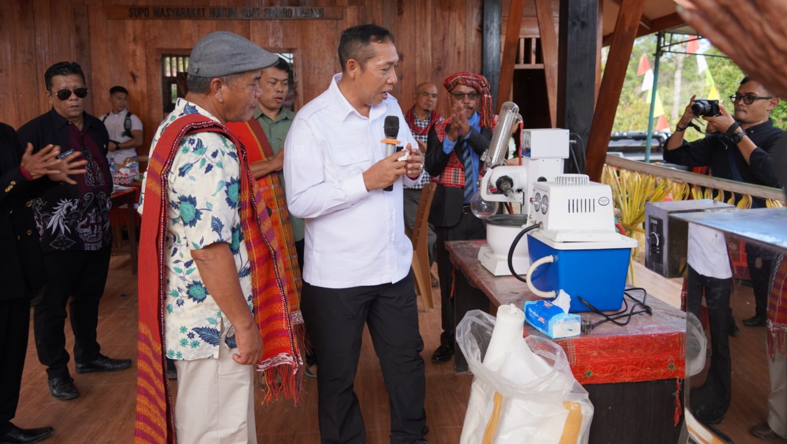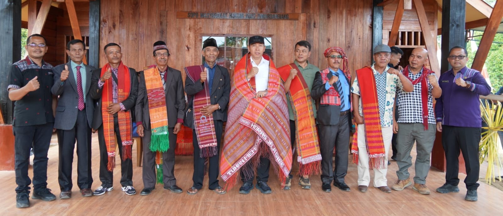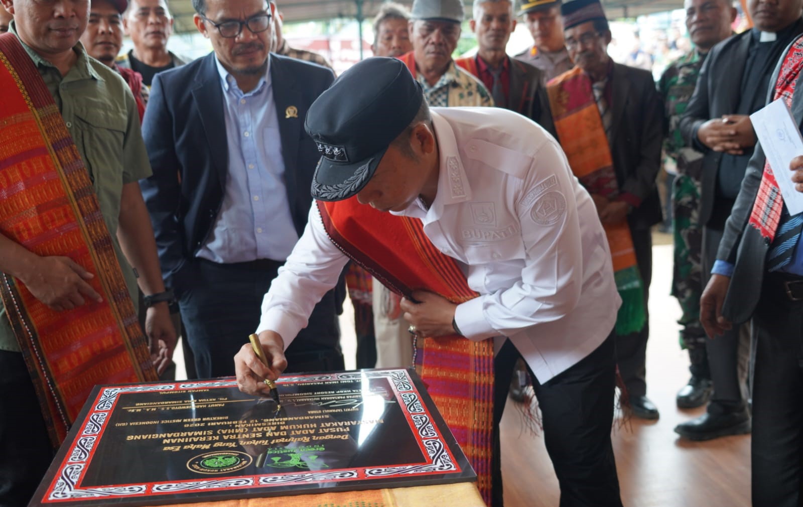Taput | mediasinarpagigroup.com – Bupati Tapanuli Utara Dr. Jonius Taripar Parsaoran Hutabarat, S. Si., M. Si didampingi Ketua MHA (Masyarakat Hukum Adat) Simardangiang Tampan Sitompul, Direktur Green Justice Indonesia (GJI), Panut Hadisiswoyo bersama tokoh adat, tokoh agama dan sejumlah pemangku kepentingan meresmikan Pusat Adat dan Sentra Kerajinan MHA Simardangiang, peluncuran Buku Kemenyan di Tapanuli, serta syukuran atas terlewatinya bencana alam yang digelar di Desa Simardangiang, Kecamatan Pahae Julu, Kamis (12/2/2026).