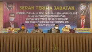 Dalam pelantikan tersebut, Drs. H. Syarifudin , M.Si yang sebelumnya menjabat sebagai kepala Kepala Dinas Kependudukan dan Pencatatan Sipil saat ini digantikan Cikwi R Inton.(Bintang)
