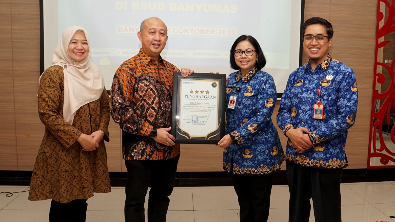 Hasil dari usaha tersebut, pada Jumat (17/10/2025), Direktur Teknologi Informasi (TI) BPJS KesehatanDr. Ir. Edwin Aristiawan, M.M. secara langsung hadir di RSUD Banyumas untuk menyerahkan Sertifikat Bintang 4 atas Komitmen RSUD Banyumas dalam Implementasi Integrasi Sistem Antrean Online, Integrasi Sistem Klaim, Implementasi E-SEP, Finger Print & Frista, dan Implementasi Bridging Farmasi.