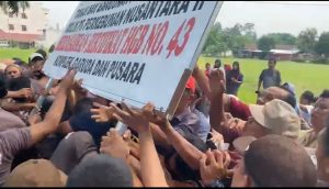 Dengan dikomando beberapa warga akhirnya mereka mendorong petugas security dan langsung merusak plank yang sudah berdiri. Karena melihat kondisi yang tidak bisa lagi dilerai, para petugas akhirnya hanya menyaksikan aksi perusakan tersebut.