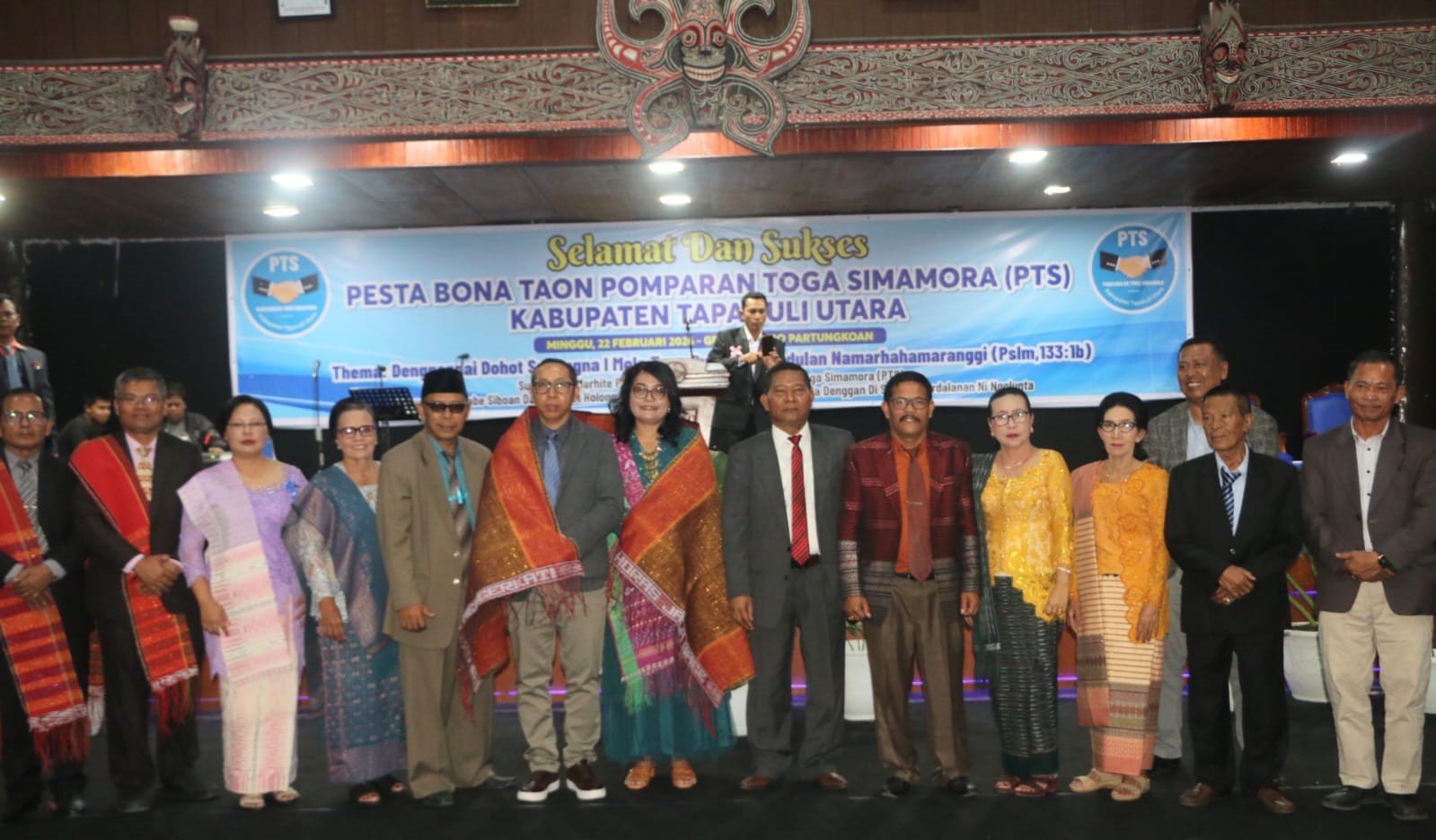 Taput | mediasinarpagigroup.com – Bupati Tapanuli Utara, Dr. Jonius Taripar Parsaoran Hutabarat, S.Si., M.Si., bersama Ketua TP. PKK Ny. Neny Angelina JTP Hutabarat menghadiri Pesta Bona Taon Pomparan Toga Simamora (PTS) yang digelar di Gedung Kesenian Sopo Partukoan, Tarutung, Minggu (22/2/2026).