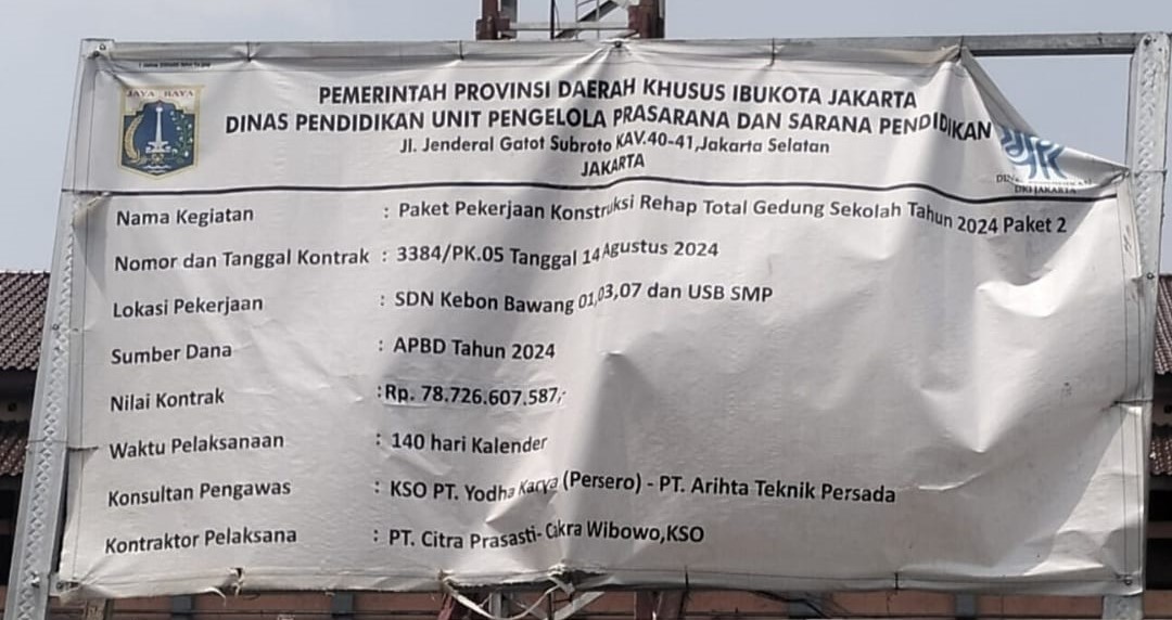 Dia menerangkan, rehab total SD Kebon Bawang 01, 03, 07 dan USB SMP masuk dalam Jasa Konstruksi Rehab Total Gedung Sekolah Tahun 2024 Paket 2 dengan KLPD Satuan Kerja Unit Pelaksana Prasarana dan Sarana Pendidikan Dinas Pendidikan DKI Jakarta.