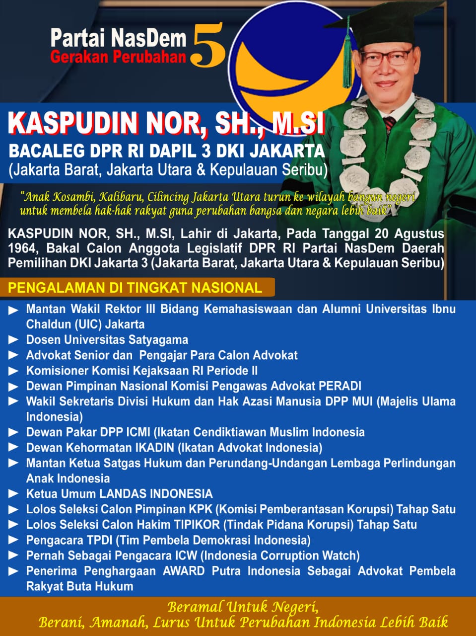 Jakarta | mediasinarpagigroup.com – Sosok Kaspudin Nor seorang putra kelahiran dan besar di Jakarta, dalam dunia politik sebagai anak bangsa Kaspudin Nor bukan sosok yang baru. Karena telah malang melintang di dunia politik sebelum lahirnya reformasi baik sebagai aktifis, akademisi dan profesi sebagai advokat.