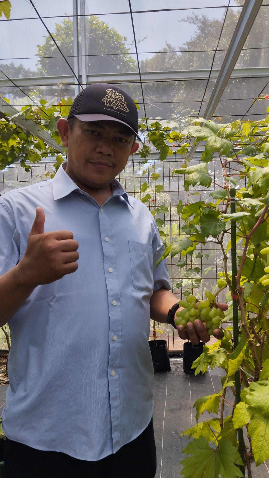 “Saya sekarang lagi lebaran di rumah saudara, kebetulan saudara saya ini juga hobi menanam anggur, ini kita liat pohonnya sudah menjalar di atas teras depan rumahnya” katanya dengan sumringah.