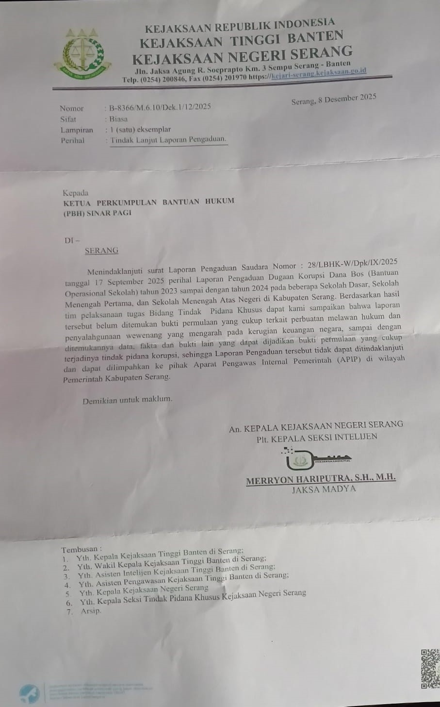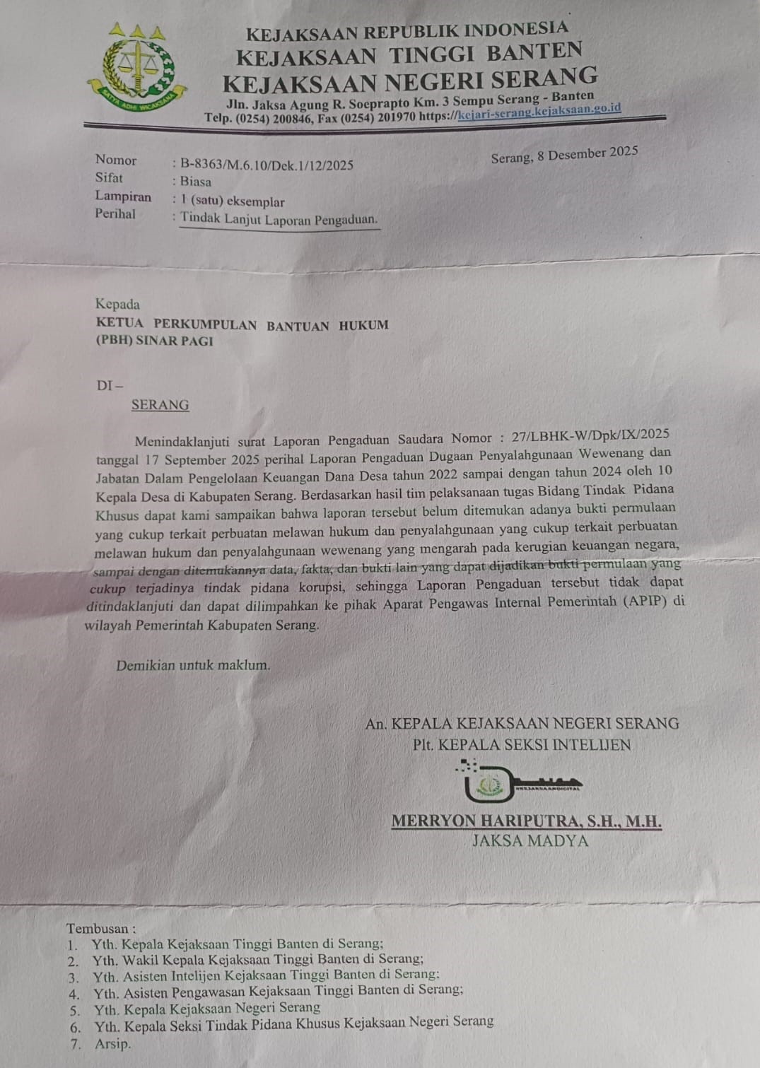 Sebelumnya, Kejaksaan Negeri Serang menyampaikan bahwa hasil telaah internal terhadap Dumas tersebut menyimpulkan belum terpenuhinya unsur bukti awal untuk ditingkatkan ke tahap penyelidikan.(Diana/Red)