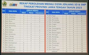 Banyumas | mediasinarpagigroup.com – Kabupaten Banyumas raih juara Umum Olimpiade Olahraga Siswa Nasional (O2SN) Tingkat Provinsi Jawa Tengah, Semarang, Sabtu, (29/7/2023). Banyumas peroleh 4 (empat) medali emas, 1 (satu) medali perak, dan 1 (satu) medali perunggu. Masing-masing perolehan kejuaraan untuk jenjang SD diraih oleh: 1) Juara 1 Cabang Kid Atletik Putra, Mohammad Nizar, Siswa SDN 1 Tambaknegara Korwilcam Dindik Rawalo, 2) Juara 1 Cabang Kid Atletik Putri jenjang SD, Annabela Novie, siswi SDN 2 Lesmana Korwilcam Dindik Ajibarang.