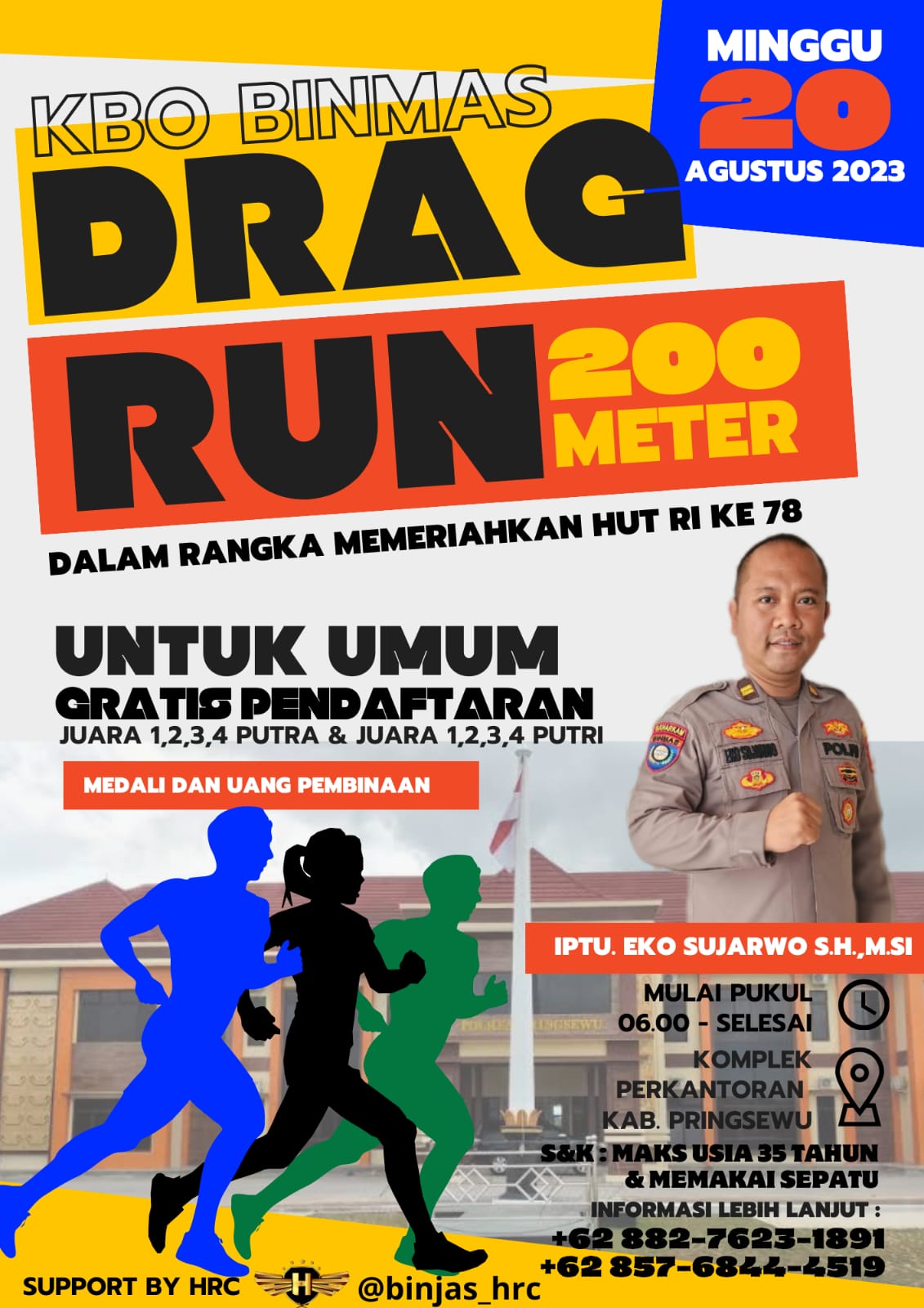 Pringsewu | mediasinarpagigroup.com – Dalam rangka memeriahkan HUT RI ke-78, KBO Sat Binmas Polres Pringsewu, Polda Lampung, akan menggelar lomba lari “Drag Run” 200 meter, berhadiah fantastis untuk masyarakat umum. Bagi yang berminat di himbau untuk segera mendaftar.