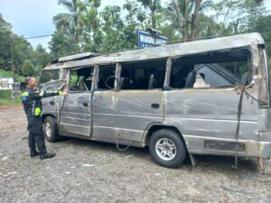 “Saat di jalan menikung dan menurun, sopir tidak bisa mengendalikan kendaraannya sehingga oleng dan miring ke kiri hingga terbalik. Mobil kemudian terseret sejauh kurang lebih 27 meter dan berhenti di bahu jalan,” jelasnya.