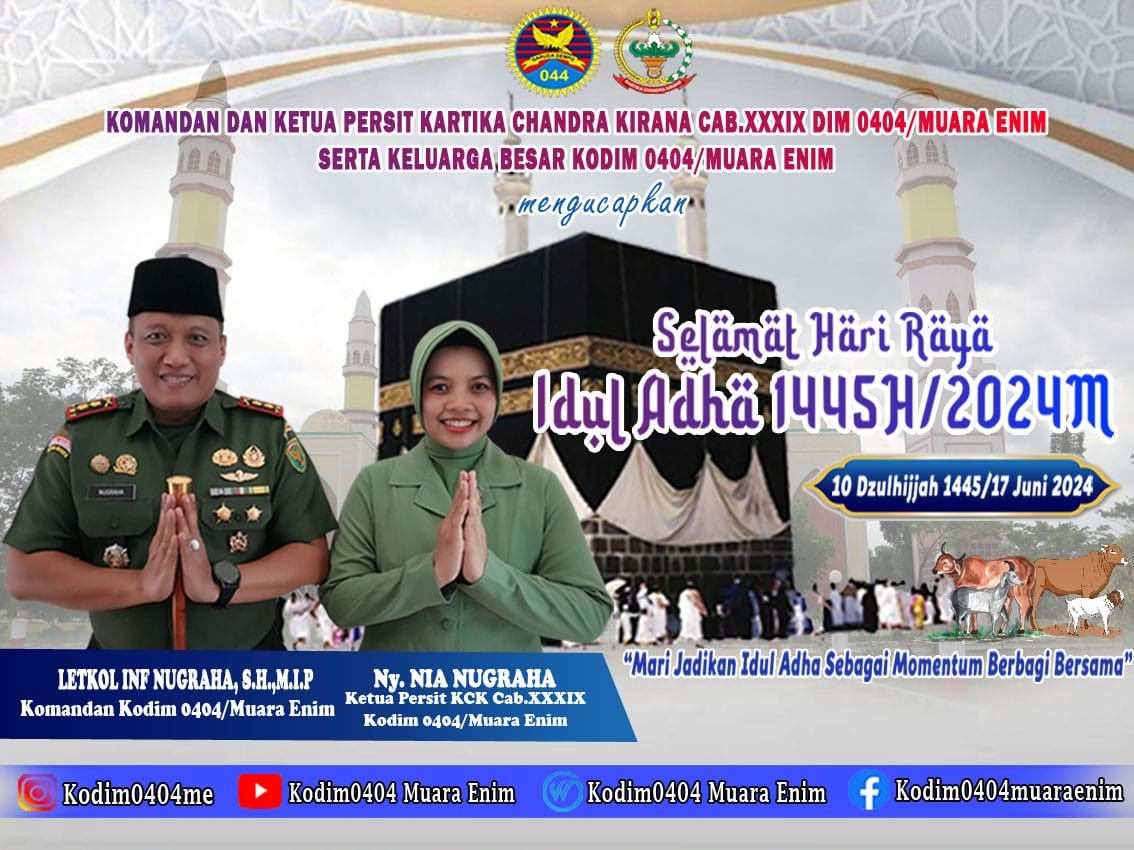 ” Selamat hari raya idul adha 1445 Hijriyah , mohon maaf lahir dan batin serta pererat silaturahmi dan juga ketaqwaan terhadap Allah SWT ,” Pungkas Komandan Kodim 0404/ Muara Enim , Letkol Inf Nugraha SH MIP.(Marsidi)
