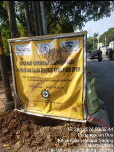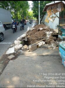 Jakarta Utara | mediasinarpagigroup.com – Galian kabel fiber optik Jalan Peganggangsaan Dia Kelapa Gading Jakarta Utara berantakan dan tidak di lakukan banner pagar pengaman sehingga mengganggu pengguna jalan dan pejalan kaki. Pasalnya, pekerjaan galian tersebut tidak mengindahkan keselamatan pengguna jalan. Galian tersebut dibiarkan terbuka, sehingga beresiko terhadap pejalan kaki dan pengguna jalan lainya.