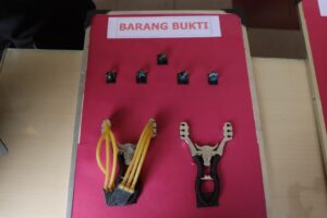 Dari penggeledahan rumah SS, petugas menemukan sejumlah barang bukti berupa sepucuk pistol Airsoft Gun, tabung gas CO2, peluru Gotri kaliber 6 mm dan 4 mm, ketapel, serta kelereng.