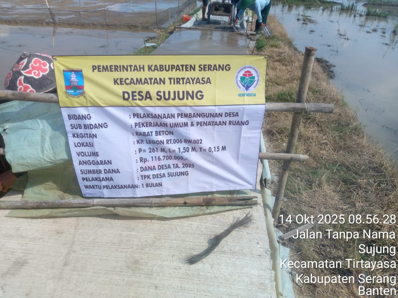 Serang | mediasinarpagigroup.com – Proyek pembangunan jalan usaha tani (JUT) di desa Sujung kecamatan Tirtayasa kabupaten Serang Banten, yang di biayai oleh anggaran dana Desa DD, sebesar Rp.116 juta lebih yang di kerjakan oleh Tim pelaksana kegiatan TPK desa Sujung, di duga di kerjakan asal jadi plastik cor hanya di pasang di pinggir pinggir nya saja ( formalitas saja), adukan semen di campur rumput komposisi tidak sesuai spesifikasi teknis.