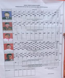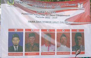 “Ditempat pemilihan suara, Ketua panitia pemilihan Ketua RW 01 Desa Cikopomayak Dade Sumarna memaparkan, Pemilihan ketua RW yang diikuti oleh 5 kandidat yakni, nomor urut 1 Acep Suhendra meraih 210 suara, Sumanta nomor urut 2 mendapatkan 113 suara, Yayan Nuryana no urut 3 mendapatkan 55 suara, Karna Wirawan no urut 4 mendapatkan 345 suara, Arjai no urut 5 mendapatkan 193 suara dari 3 tempat pemilihan suara (TPS).