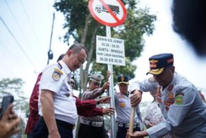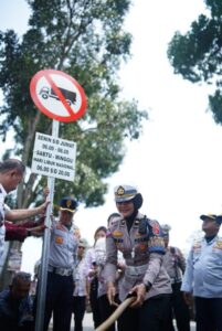 Adapun rambu lalu lintas yang dipasang merupakan himbauan pembatasan Pengguna Kendaraan Berat, meliputi : – Hari Senin-Jumat 06.00-08.00 WIB., – Hari Sabtu-Minggu 06.00-20.00 WIB