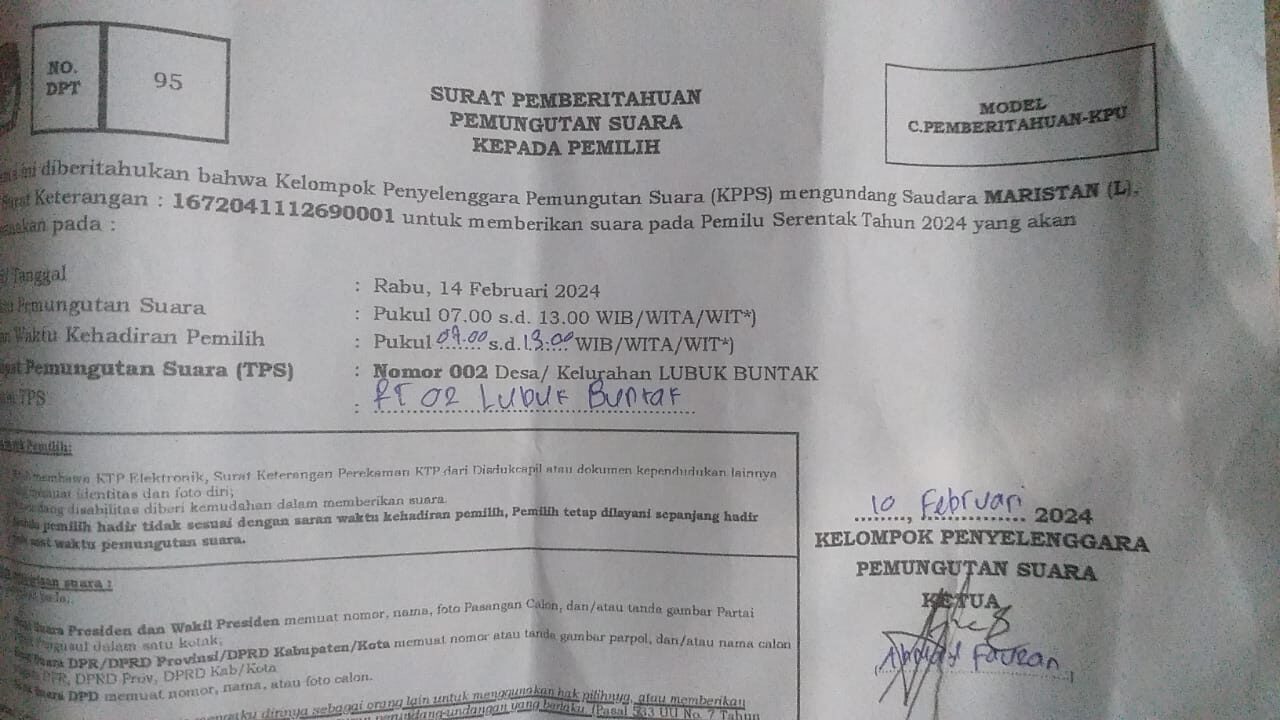 Setelah di konfirmasi Jonsi dan Mordiono selalu PPK di kantor kelurahan Lubuk Buntak, “Data tersebut bukan dari dia namun data tersebut dari klu, dan Jonsi selalu PPK sempempat mengatakan kepada saya untuk apa kamu ngurusi ini? Padahal ini saya menanyakan seputaran pendataan saya yang di data oleh petugas pantaelih beberapa bulan yang lalu bahwa saya terdaftar memilih di TPS 01 Rt 01 tapi kenyataanya berbeda. Salah seorang PPK yang bernamai Murdiono dia mengatakan bahwah saya semenjak pemilu tahun 2019.yang lalu nyoblos di TPS 02 katanya. Jadi kalau begitu untuk apa adanya pendataan pantaelih beberapa bulan yang lain kalau masih data lama yang di pakai. Kami selalu masyarakat sangat kecwa dengan kejadian kayak gini kami mengharapkan kedepanya tidak terjadi lagi seperti ini.”