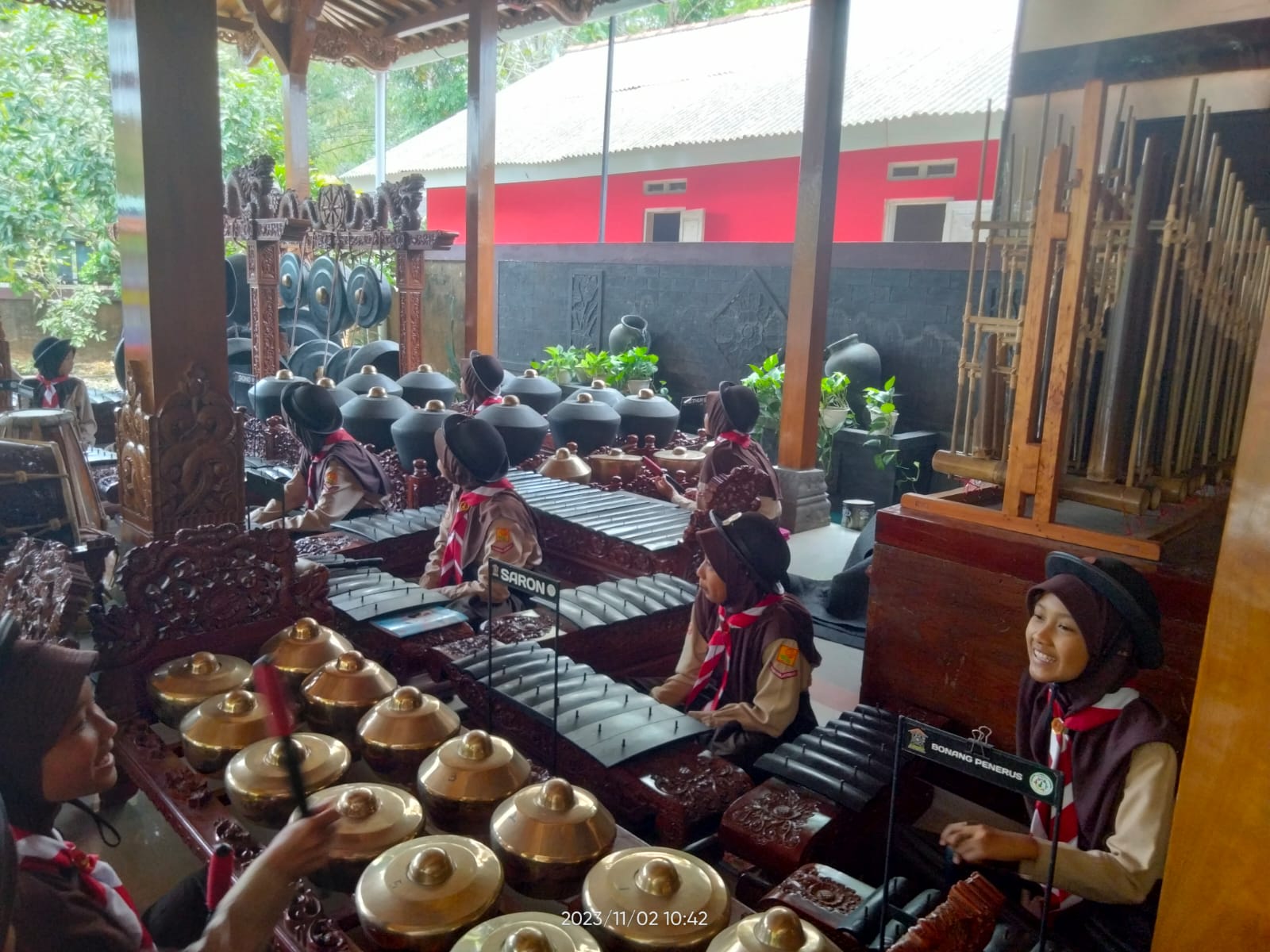 Tujuan selanjutnya adalah oemah gamelan. Adik-adik penggalang dikenalkan dengan nama-nama alat musik gamelan terlebih dahulu. Kemudian secara bersama-sama memainkan alat musik gamelan.