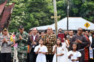 Samosir | mediasinarpagigroup.com – Bupati Samosir dan Wabup Martua Sitanggang ikuti perayaan Paskah Raya Kabupaten Samosir di Gereja Katolik Stasi Methodius Sianjung-anjung Desa Siboro Kecamatan Sianjur Mula mula, 26/04.