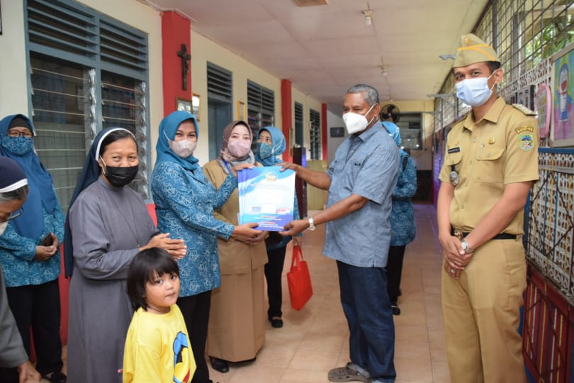 Ny Erna Husein yang didampingi Camat Banyumas Oka Yudhistira dan Plt Kepala Dinas Kependudukan dan Pencatatan Sipil Kabupaten Banyumas Lily Listiani menyerahkan 10 akta dan KIA kepada Kepala Panti Asuhan Bunda Serayu Banyumas Suster Agnes Marni, SJMJ dan Pastor Paroki St Maria Imaculata Banyumas Rm Nico Ola, OMI.