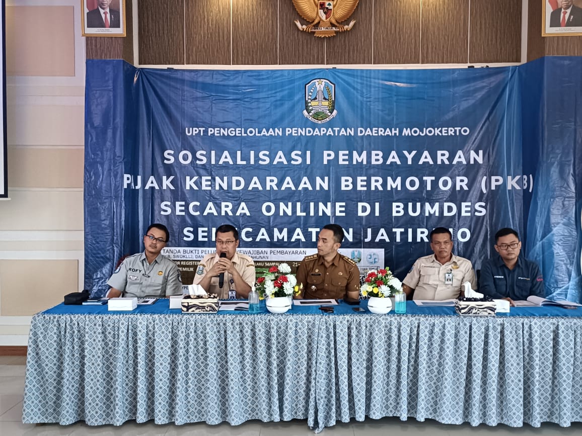 Mojokerto | mediasinarpagigroup.com – Guna semakin mempermudah masyarakat untuk pembayaran pajak kendaraan bermotor, Senin 06 Mei 2024 Tim Samsat UPT Mojokerto melaksanakan kegiatan Sosialisasi Pembayaran Pajak Kendaraan Bermotor (PKB) secara Online di BUMDES se Kecamatan Jatirejo, Mojokerto Kabupaten. Kegiatan ini dilaksanakan di Aula Kantor Kecamatan Jatirejo dan dihadiri langsung oleh Camat Jatirejo Bapak Harfendi Setiyapraja, S.STP, M.Si, Ka UPT PPD Samsat Mojokerto Bapak Gito Sampurno, S.Sos, M.Si dan dari Pihak Jasa Raharja diwakili oleh PJ Samsat Mojokerto Bapak Rofy Dimas Putra, S.AB, RSA.