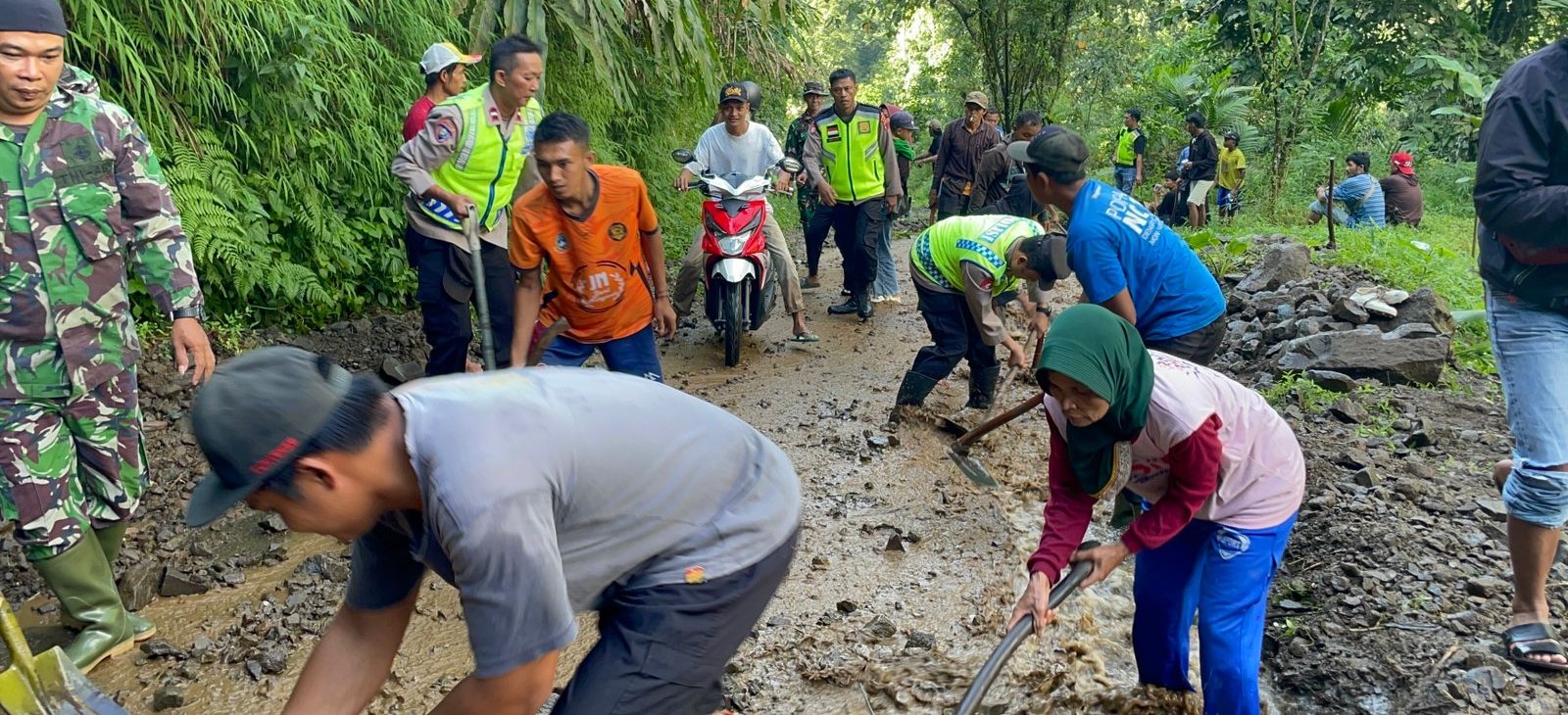 Polisi bergabung dengan personel TNI Koramil Karangmoncol, Badan Penanggulangan Bencana Daerah (BPBD), dan masyarakat desa setempat dalam pembersihan material longsor tersebut.