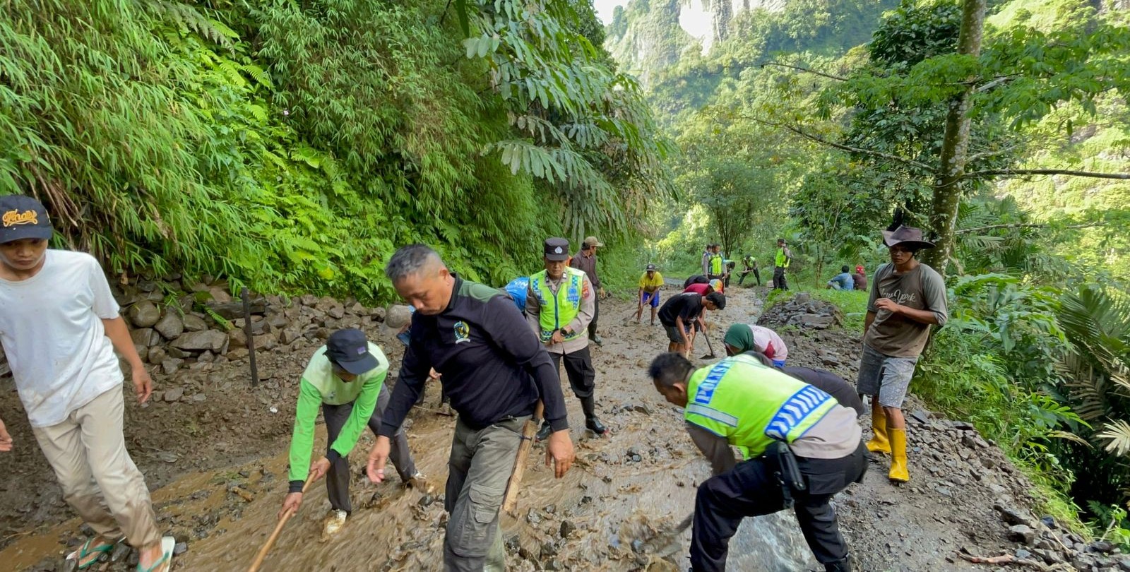 Kapolsek menyampaikan ucapan terima kasih kepada seluruh pihak yang terlibat dalam penanganan tanah longsor. Dengan kerja bakti yang dilakukan dapat mempercepat proses penanganan.