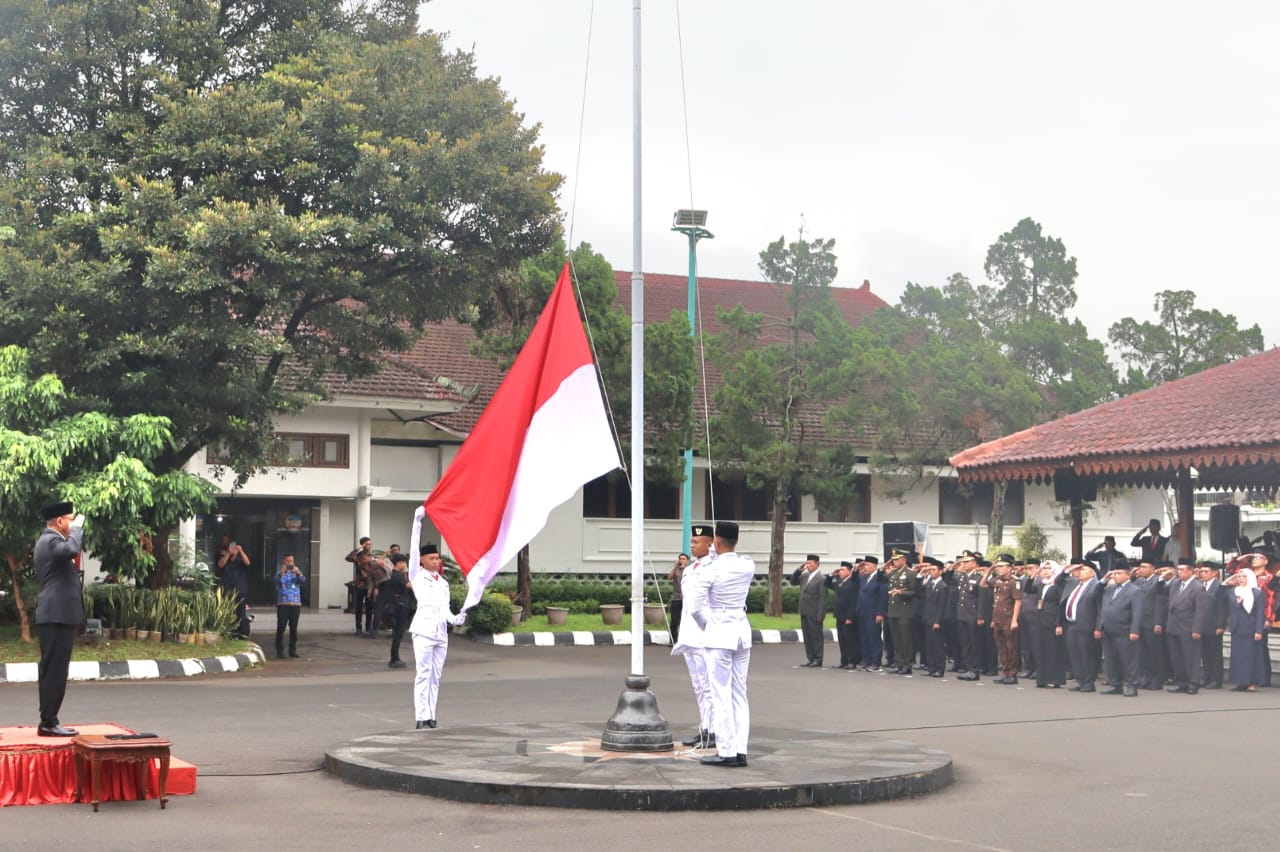 Bupati Banyumas, Sadewo Tri Lastiono bertindak sebagai inspektur upacara dengan peserta dari unsur Forkompimda, ASN, TNI, Polri, orgnisasi masyarakat serta perwakilan siswa sekolah Kabupaten Banyumas.