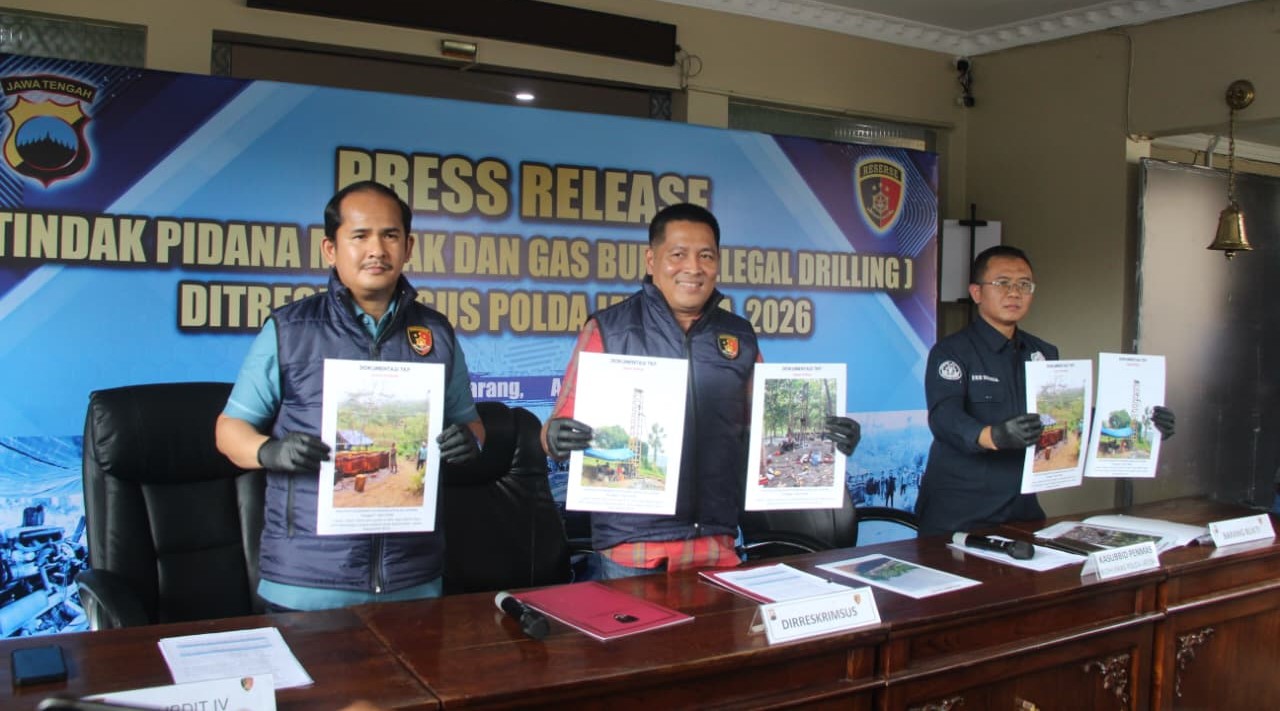 Hal ini disampaikan Dirreskrimsus Polda Jateng Kombes Pol Djoko Julianto dalam konferensi pers ungkap kasus penyalahgunaan migas yang digelar di Mako Ditreskrimsus Polda Jateng, Jl. Sukun Raya, Banyumanik, Kota Semarang pada Selasa (14/4/2026) siang. Dari pengungkapan di tiga lokasi ini petugas berhasil mengamankan tiga orang tersangka yang diduga kuat bertanggung jawab atas aktivitas pengeboran minyak ilegal di wilayah tersebut.