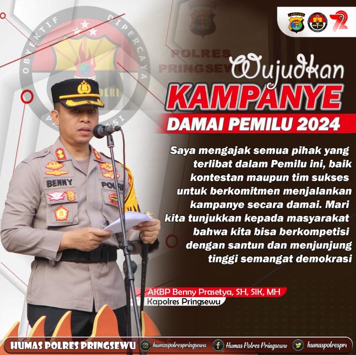 Kapolres Pringsewu, AKBP Benny Prasetya, menekankan pentingnya menjaga ketertiban dan keamanan selama proses kampanye. Beliau mengungkapkan bahwa Polres Pringsewu siap memberikan dukungan dan pengamanan maksimal demi kelancaran jalannya kampanye Pemilu 2024.