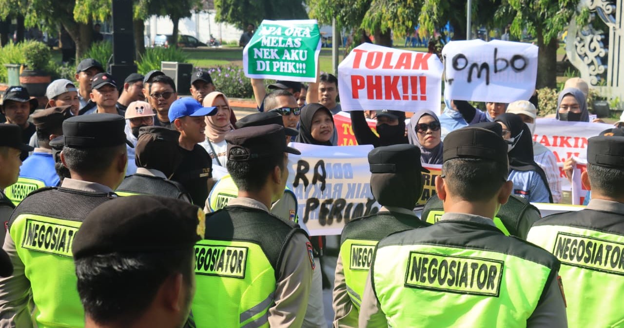 Polisi dari Polres Purbalingga yang disiapkan memberikan pelayanan pengamanan unjuk rasa bersiaga di pintu masuk Pendopo Kabupaten Purbalingga. Personel yang disiagakan yaitu tim negosiator dan Pleton Dalmas Awal.