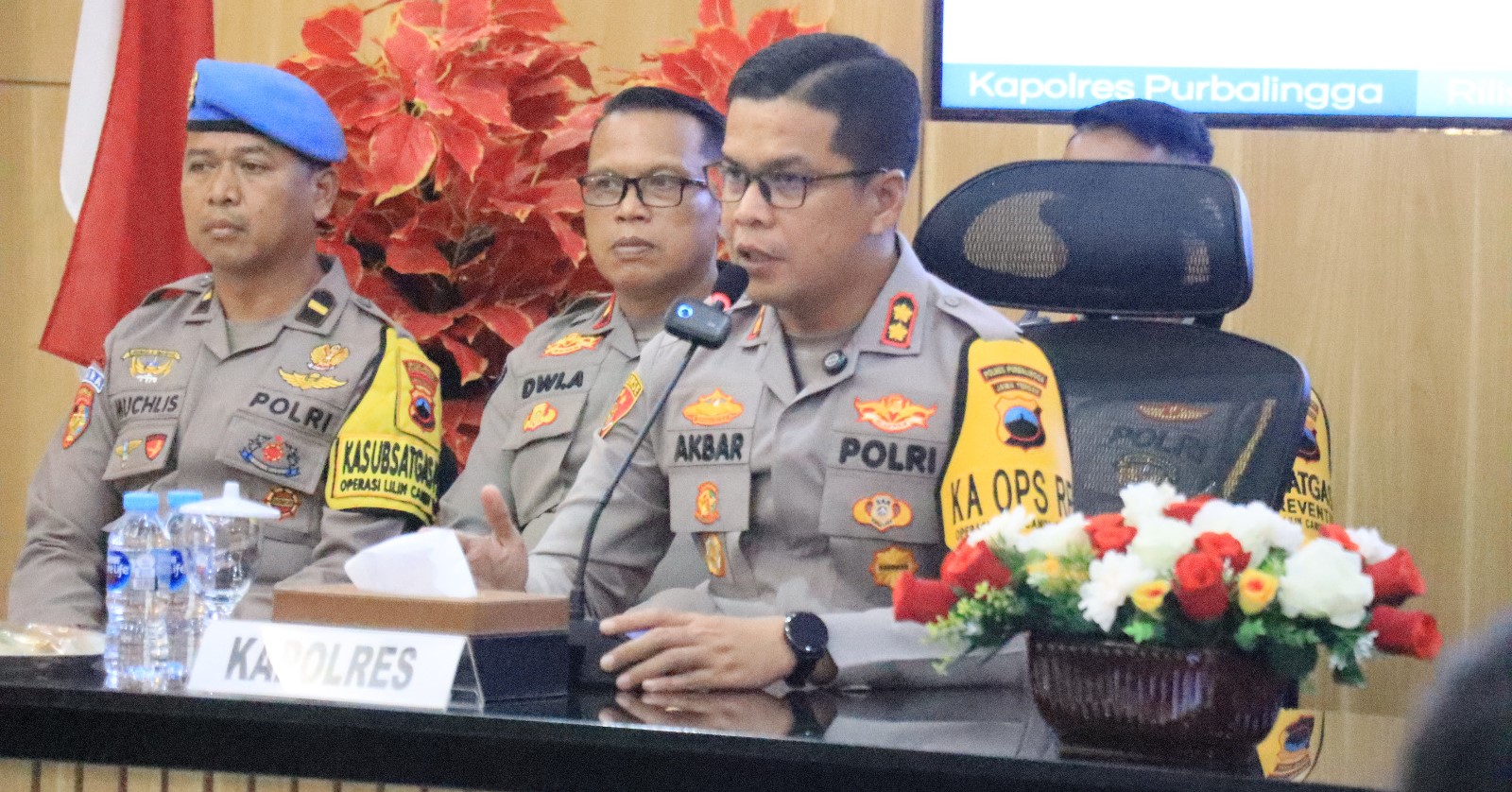 Kapolres Purbalingga menyampaikan paparan tentang jumlah gangguan kamtibmas yang terjadi dalam kurun waktu satu tahun meliputi kriminalitas, bentuk pelanggaran, gangguan dan bencana.