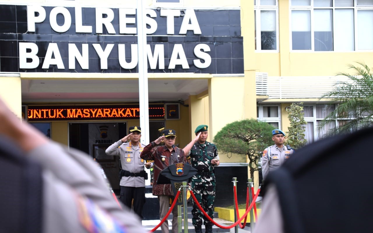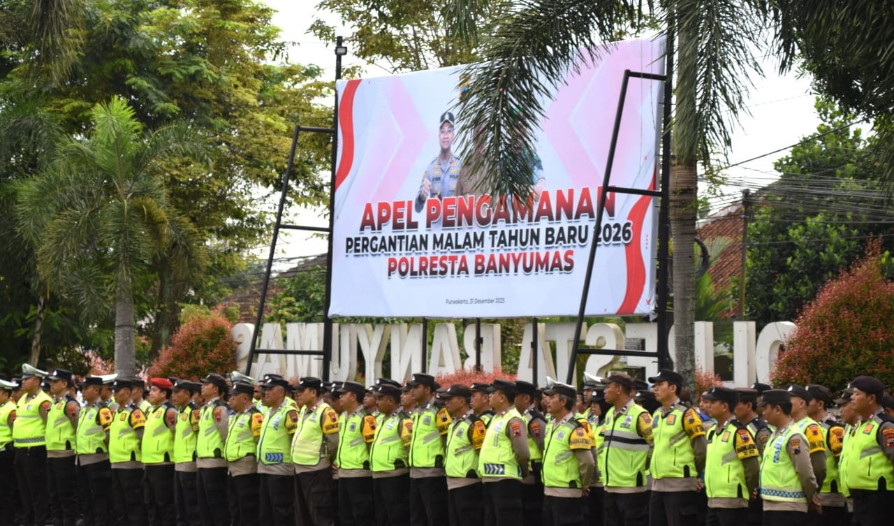 Banyumas | mediasinarpagigroup.com – Dalam upaya memastikan momen pergantian tahun baru berjalan dengan rasa aman, nyaman dan penuh ketenangan bagi warganya, Bupati Banyumas Sadewo Tri Lastiono didampingi Kapolresta Banyumas Kombes Pol Ari Wibowo dan Komandan Kodim 0701 Banyumas Letkol Inf Edward Samosir, memimpin apel kesiapan pelayanan masyarakat menyambut tahun baru 2026 yang digelar pada Rabu (31/12/25) sore bertempat di Halaman Mapolresta Banyumas. Hadir dalam apel tersebut, para pimpinan dan personel pengamanan dari Polresta Banyumas, Kodim 0701 Banyumas, Denpom IV/1 Purwokerto, Batalyon D Pelopor Satbrimobda Jawa Tengah, Satpol PP Kabupaten Banyumas dan Dinas Perhubungan Kabupaten Banyumas.