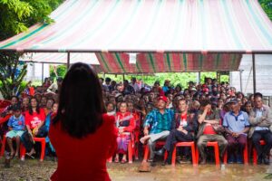 “Sejak proklamasi kemerdekaan pada 17 Agustus 1945, tidak ada lagi dinasti di negara kita ini. Presiden maupun Kepala Daerah dipilih oleh rakyat, tidak diwariskan secara turun-temurun. Kalau dinasti itu diwariskan, kita kan dipilih langsung oleh rakyat. Betul tidak seorang Bupati dipilih langsung oleh rakyat?,” tanya Satika Simamora dan dijawab betul oleh warga.