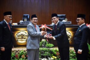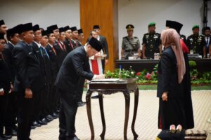 Banyumas | mediasinarpagigroup.com – Ketua Pengadilan Negeri Purwokerto Rudy Ruswoyo mengambil sumpah dan janji 50 anggota DPRD Kabupaten Banyumas masa jabatan 2024-2029. Pelantikan anggota legislatif hasil Pemilu 2024 itu dilaksanakan dalam Rapat Paripurna Terbuka DPRD Kabupaten Banyumas yang dipimpin oleh Ketua DPRD Masa Jabatan 2019-2024 dr Budhi Setiawan, dengan agenda Pengucapan Sumpah/Janji Anggota DPRD Kabupaten Banyumas Masa Jabatan 2024-2029 di gedung baru DPRD Kabupaten Banyumas, Jl Bung Karno Komplek Menara Purwokerto Selasa 20 Agustus 2024.