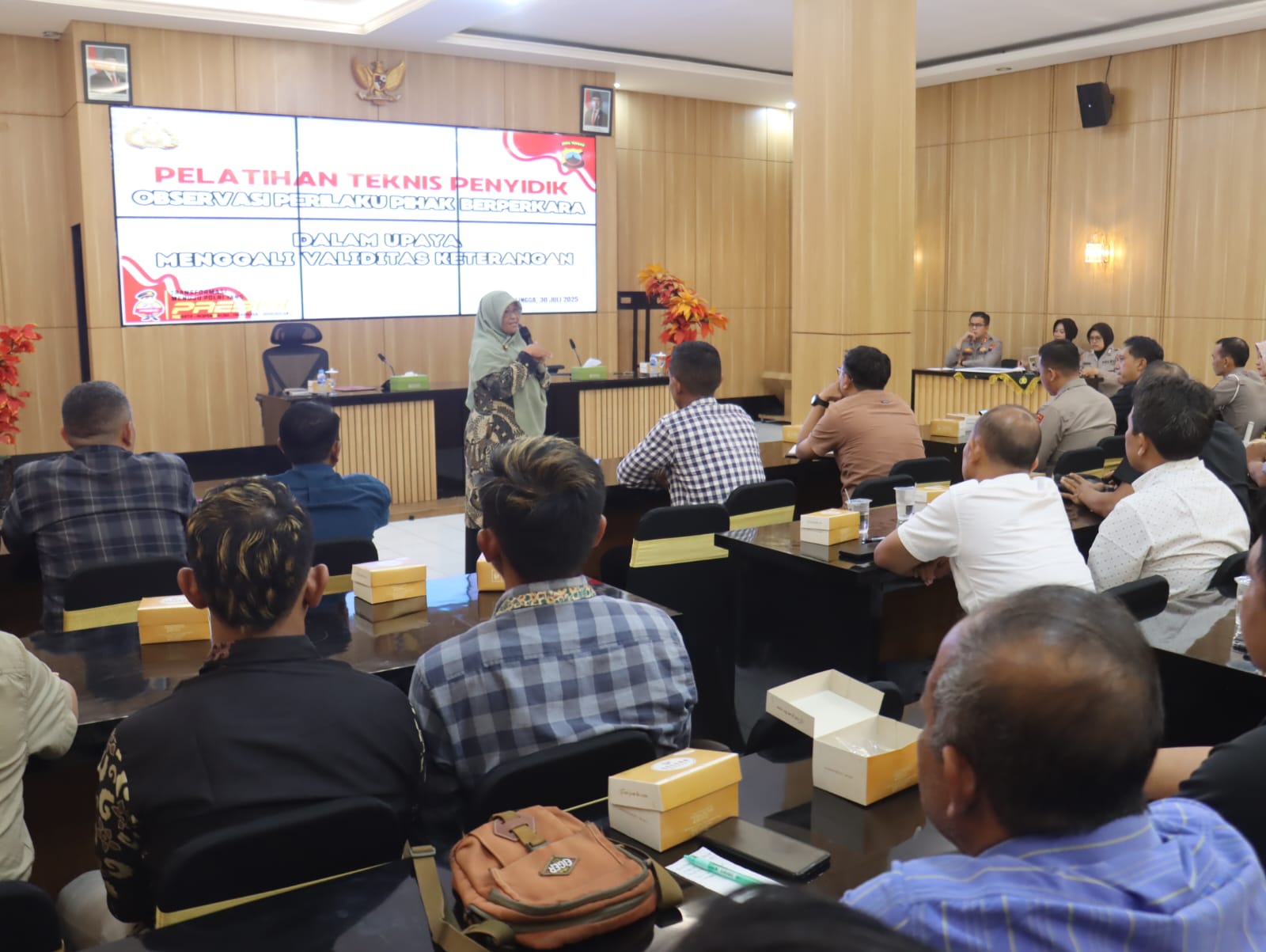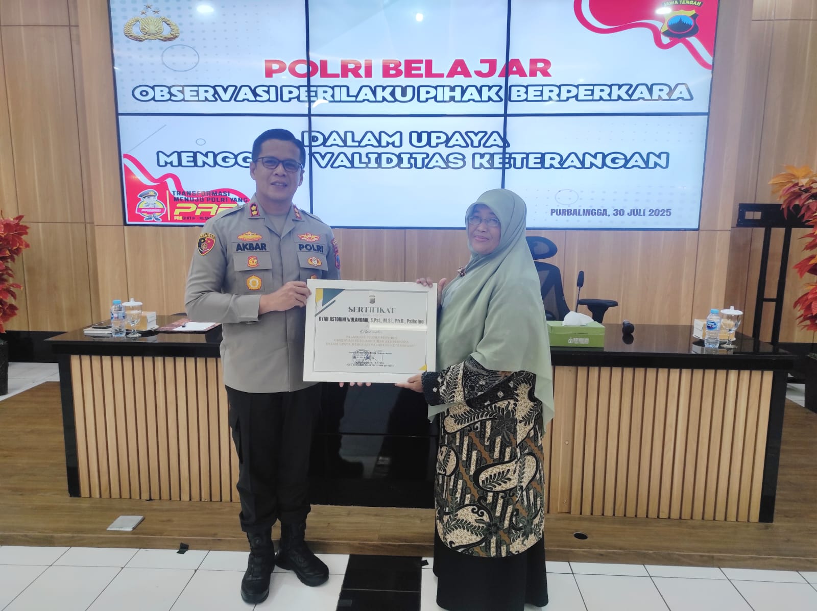 Kapolres Purbalingga AKBP Achmad Akbar mengatakan hari ini diselenggarakan pelatihan teknis dengan topik Observasi Perilaku Pihak Berperkara Dalam Upaya Menggali Validitas Keterangan.