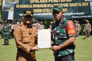 Banyumas | mediasinarpagigroup.com – Program TNI Manunggal Membangun Desa (TMMD) Sengkuyung Tahap 1 Tahun Anggaran 2024 di Desa Gunung Wetan, Kecamatan Jatilawang Kabupaten Banyumas secara resmi ditutup dengan gelaran upacara di lapangan desa setempat, Rabu (20/3/2024). Sebagai inspektur upacara adalah Komandan Kodim 0701 Banyumas Letkol Arm Ida Bagus Adi Purnama.