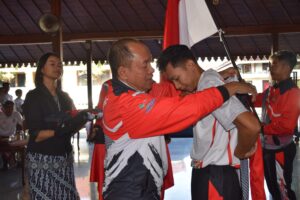 Pelepasan kontingen ditandai dengan pemakaian jaket oleh Wakil Bupati Banyumas kepada perwakilan 10 atlet yang diikuti oleh seluruh atlet yang hadir. (Widoyo)