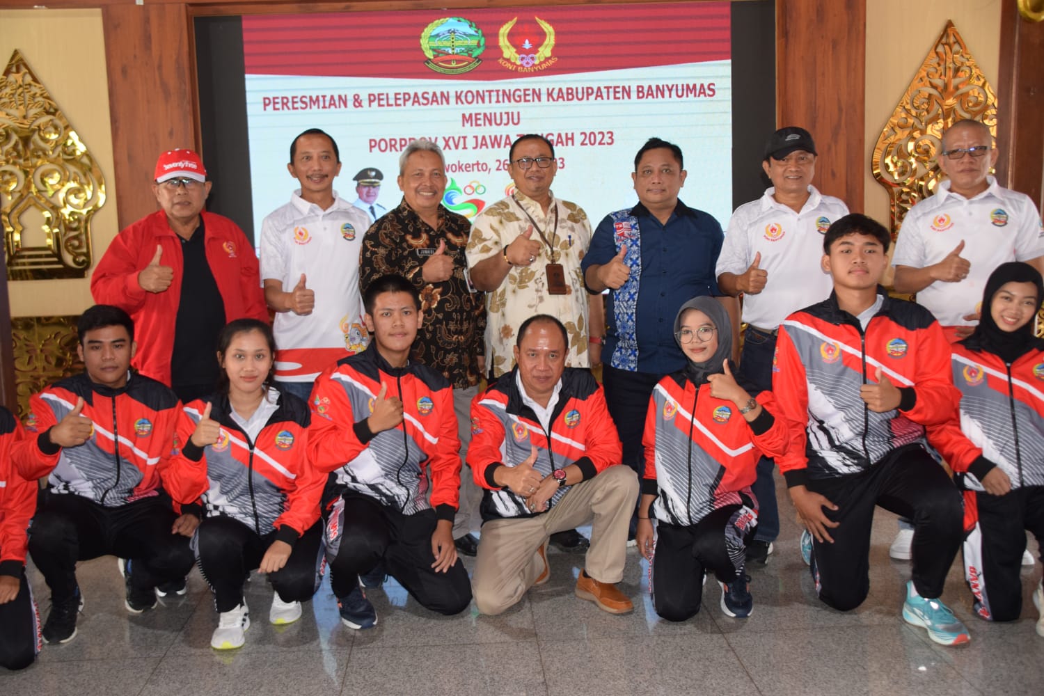 Pelepasan kontingen ditandai dengan pemakaian jaket oleh Wakil Bupati Banyumas kepada perwakilan 10 atlet yang diikuti oleh seluruh atlet yang hadir. (Widoyo)