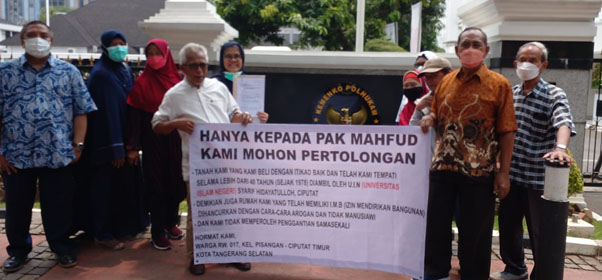 Tanah kami dirampas serta bangunan dihancurkan Oleh Universitas Islam Negeri (UIN) Syarif Hidayatullah Ciputat dan tanpa penggantian sama sekali atau uang kerohiman,  Kami berharap pemerintah untuk menindaklajuti permasalahan ini. Dan mohon keadilan, kami mohon perlindungan kepada Negara Republik Indonesia,” tutur Maria.
